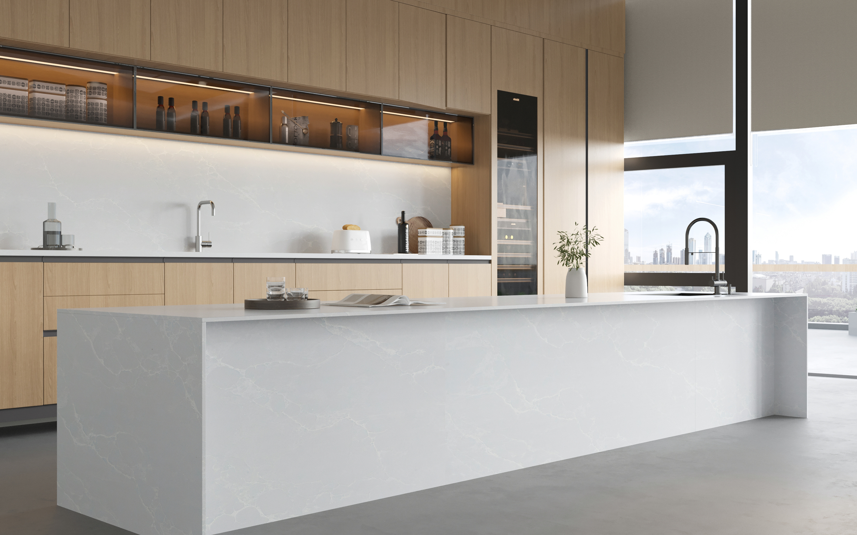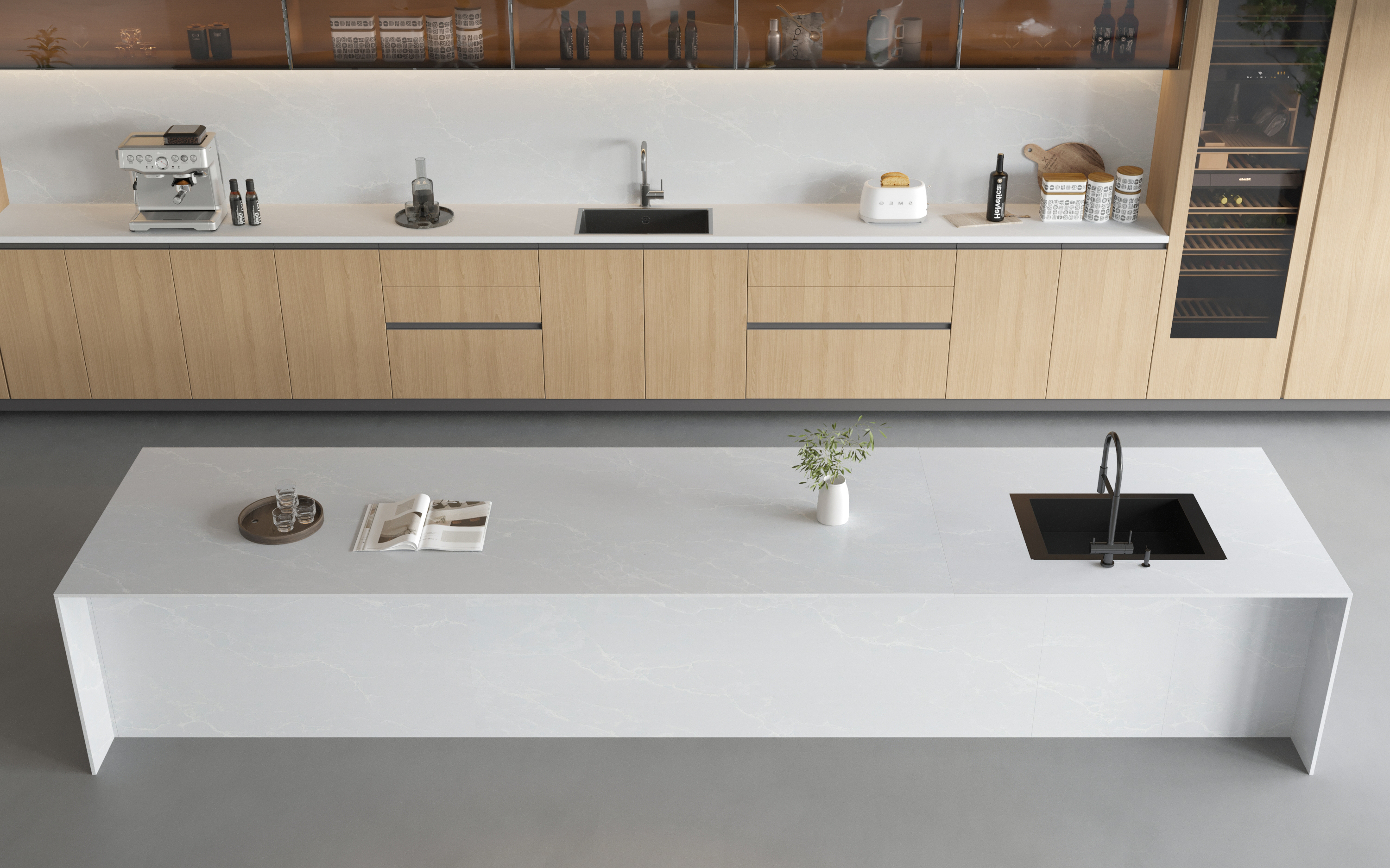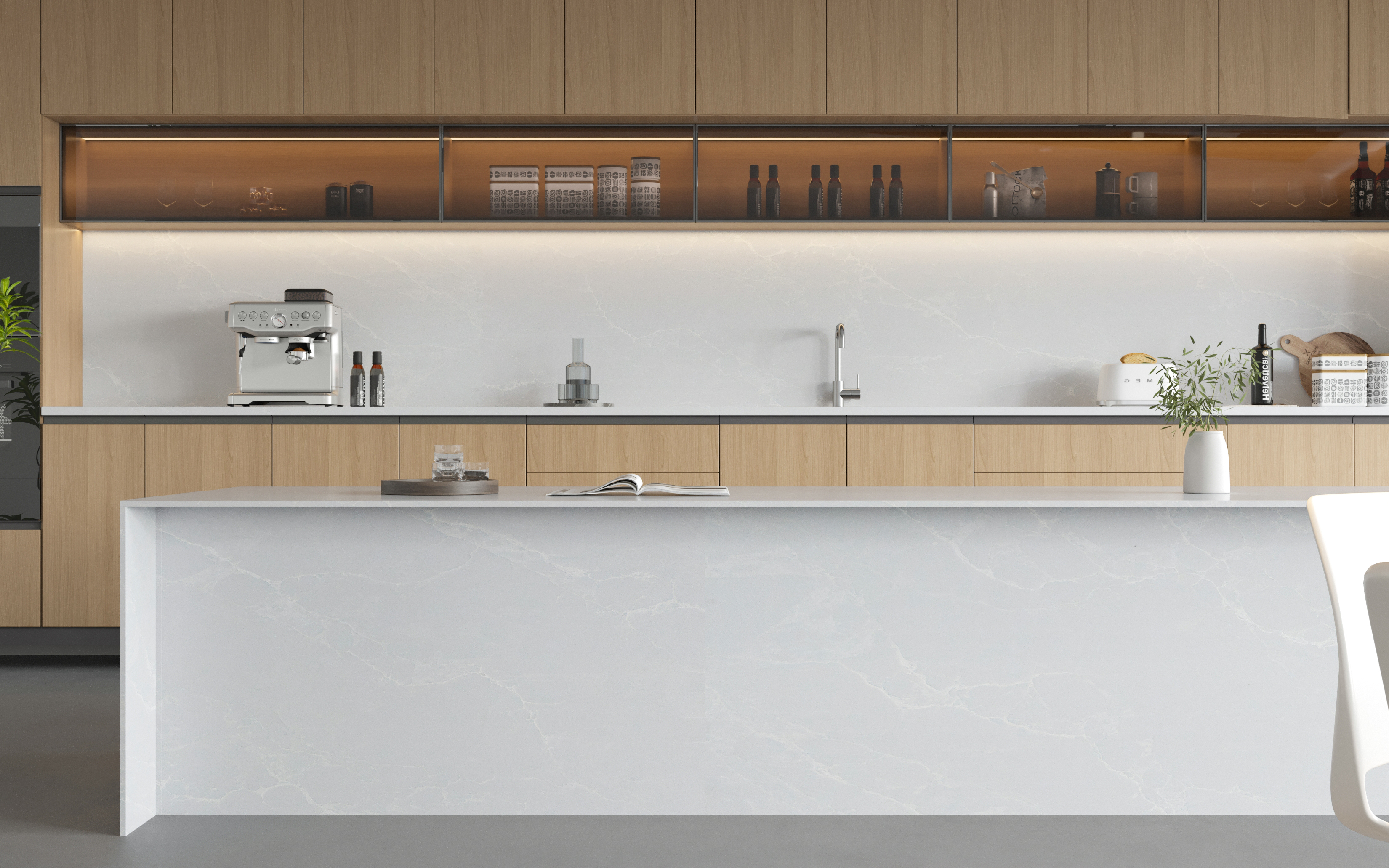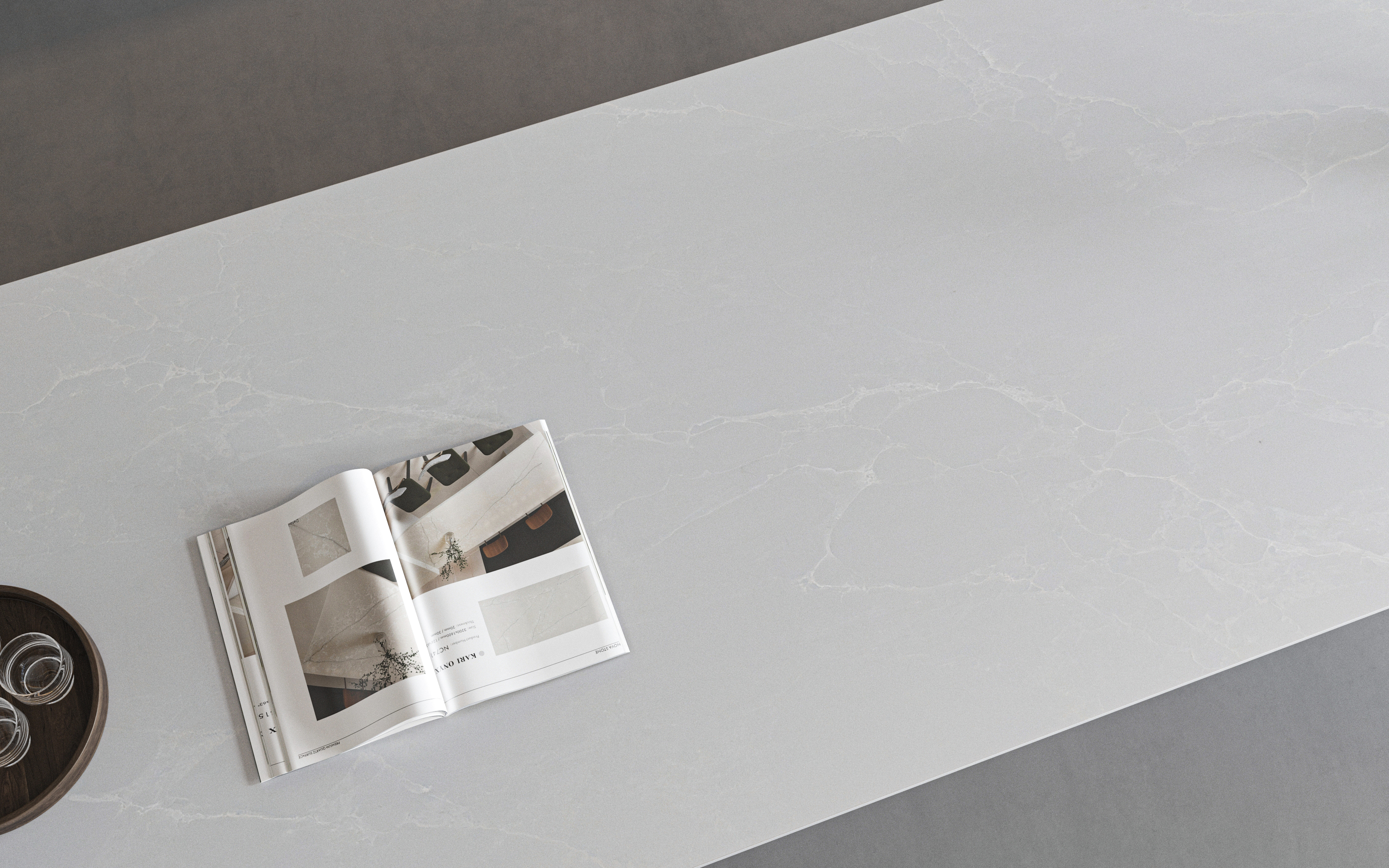 This delicate surface features a crisp, icy-white background subtly interwoven with cloud-like veining in pale silver. Its clean, luminous surface adds a sense of openness and refinement. Ideal for bright, modern spaces seeking a minimalist yet sophisticated touch.