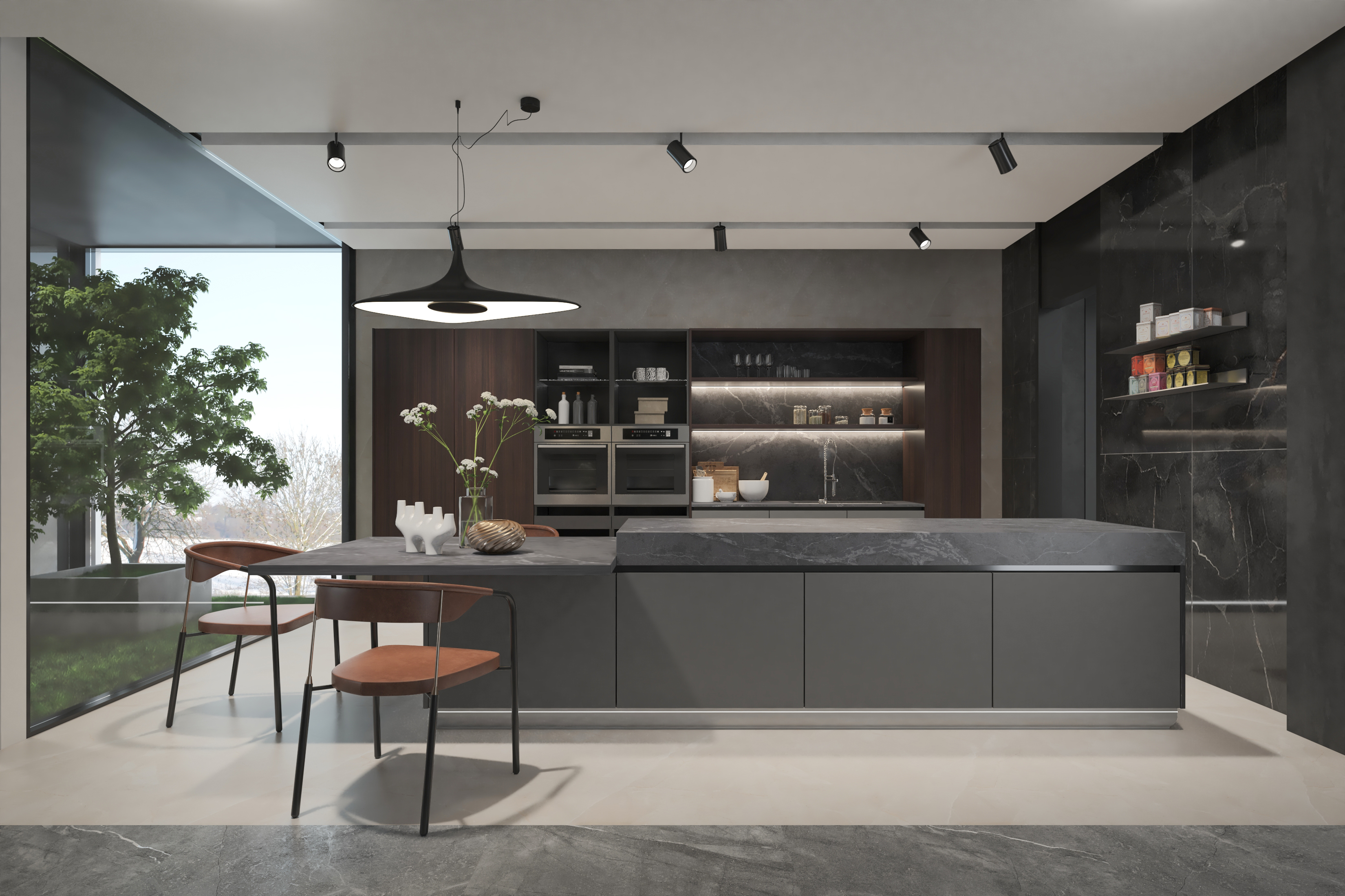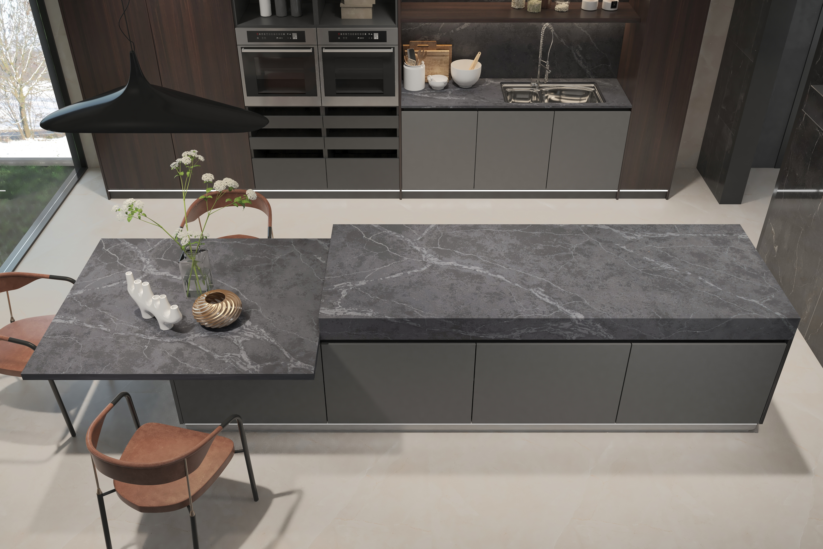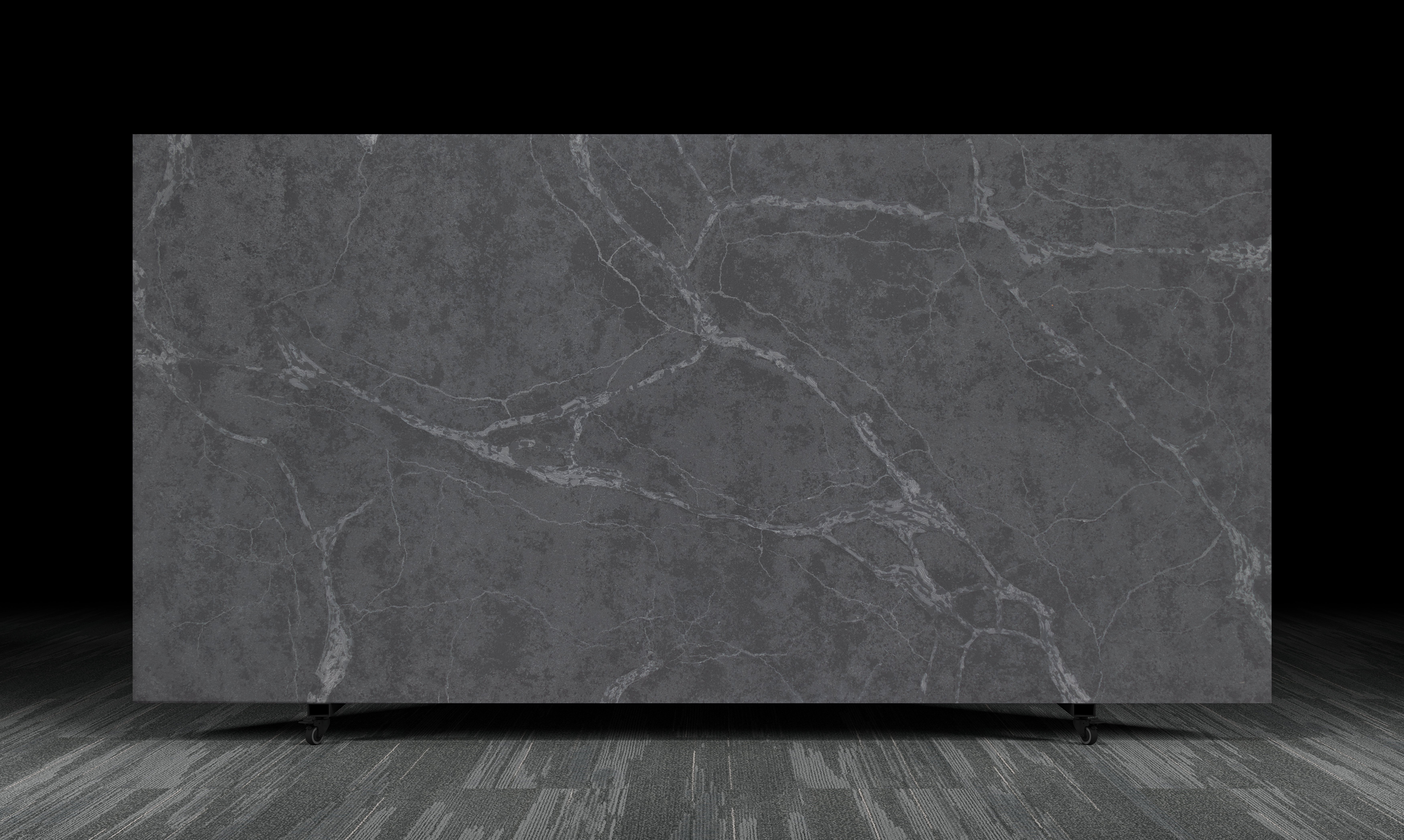 Carbonelli is a striking dark quartz slab featuring deep charcoal tones laced with dramatic white veining. Its bold contrast and fine-grained texture make it a luxurious choice for modern kitchens, bathrooms, or statement walls.