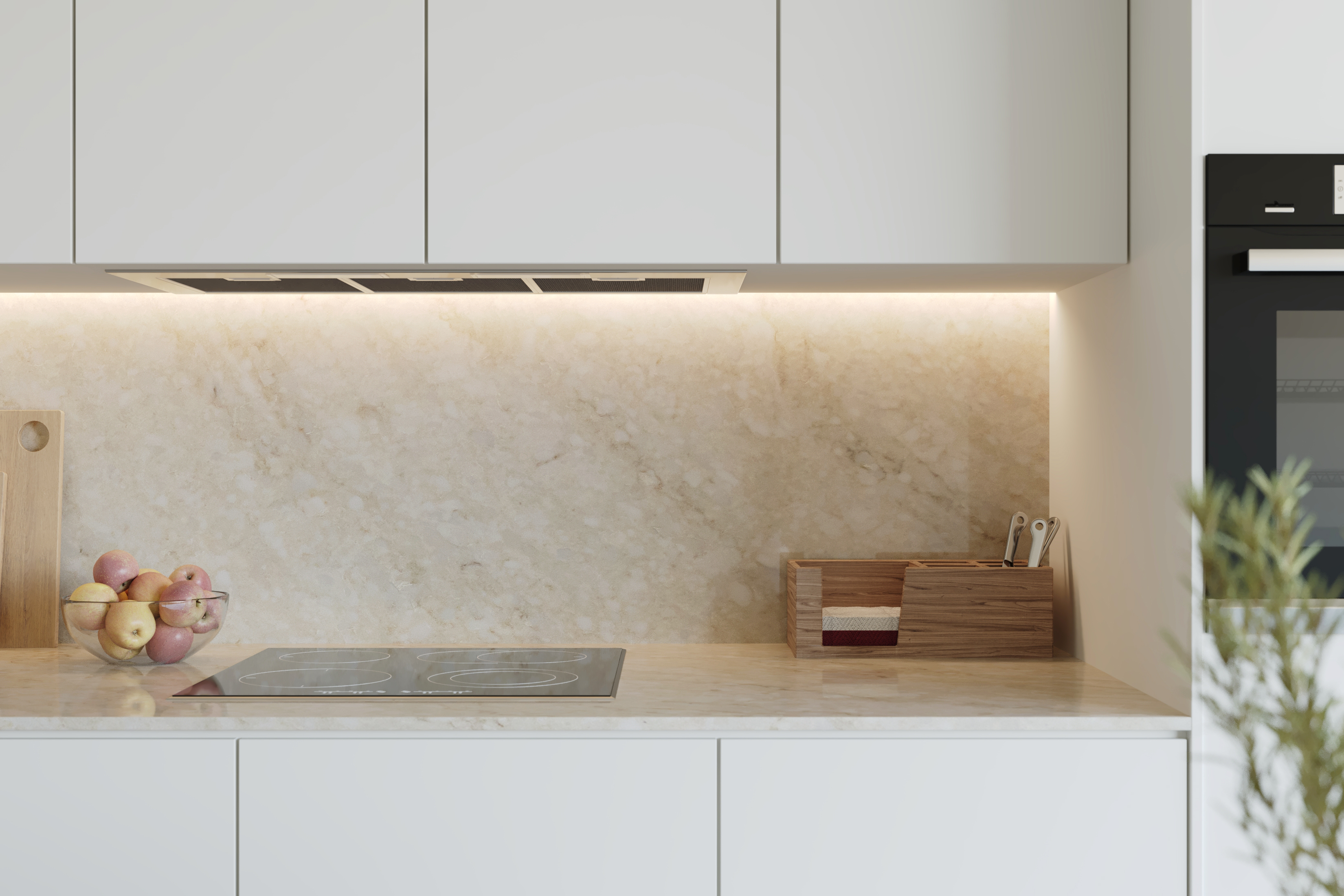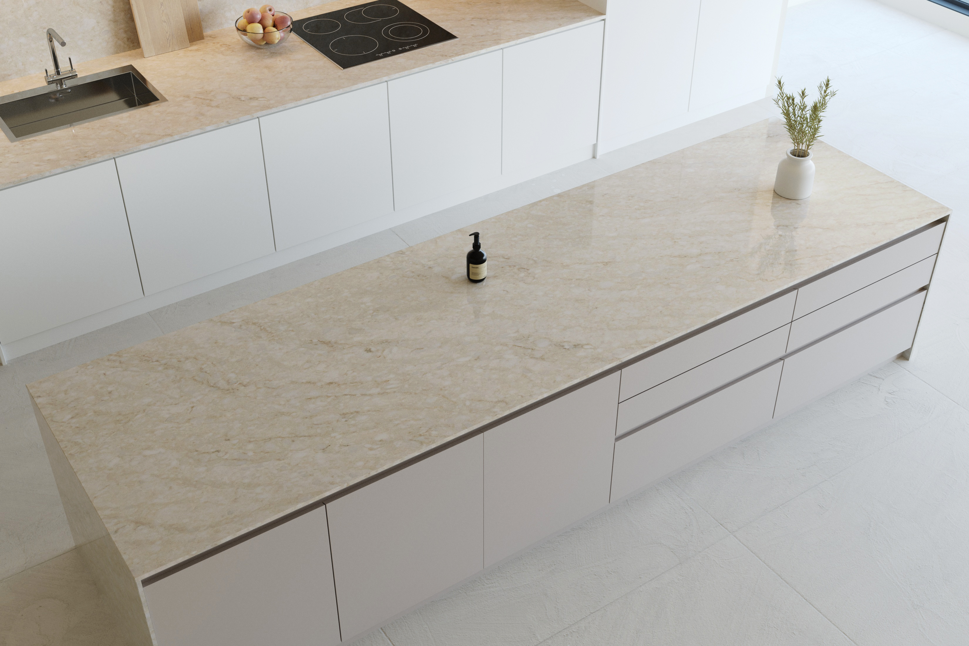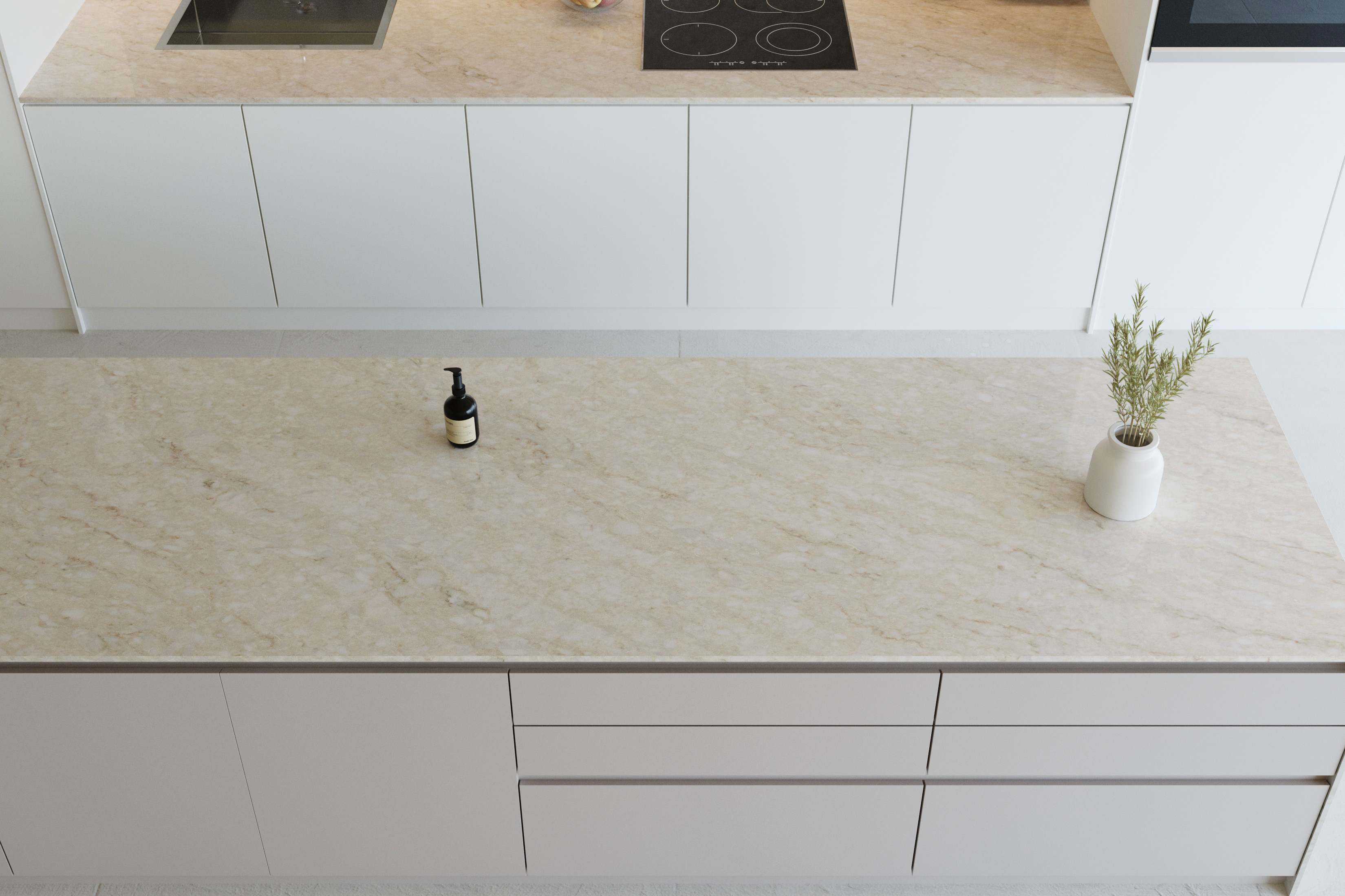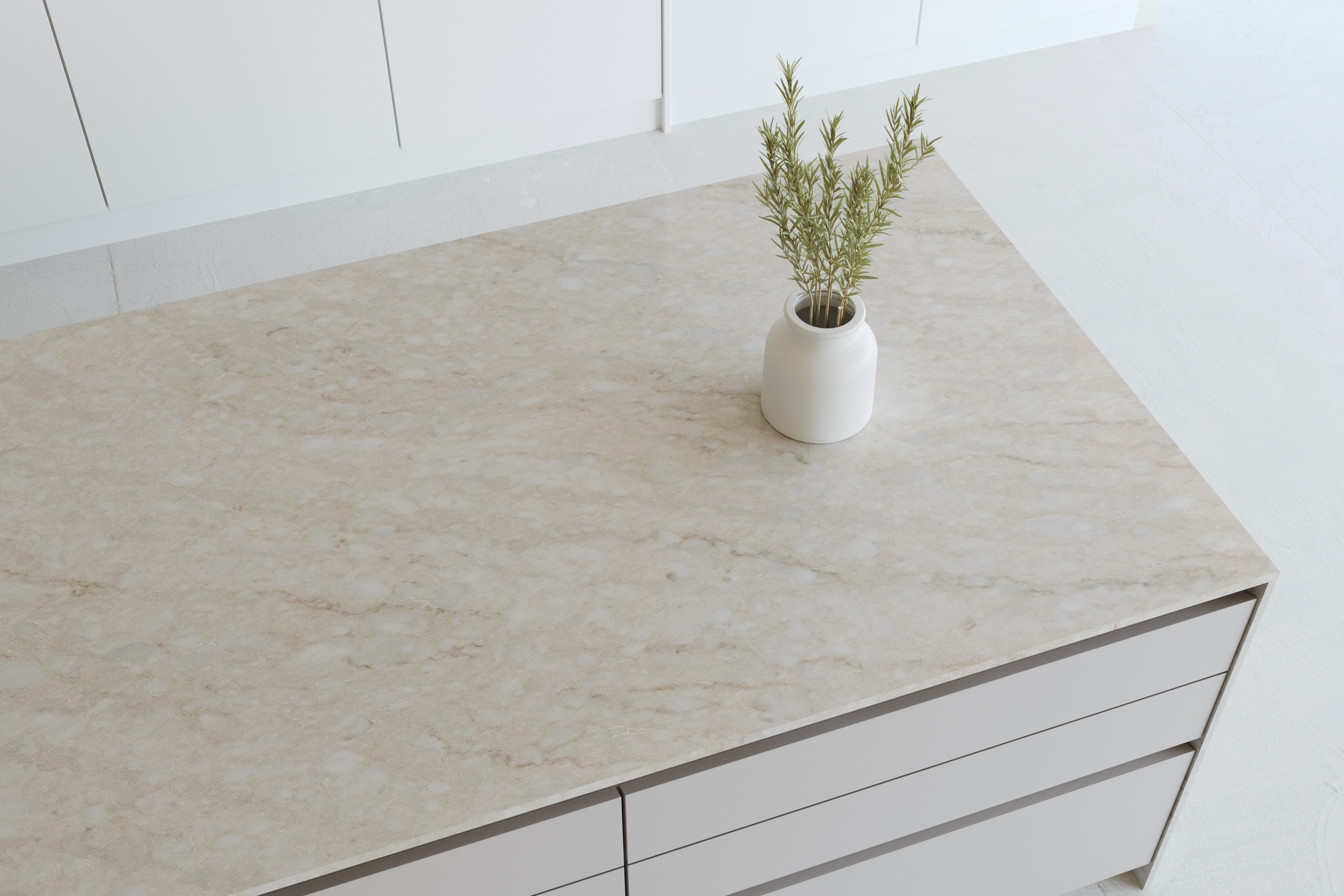 This warm-toned quartz slab features a soft, sandy beige background with gentle waves of cream and light taupe, creating a sense of natural movement. Subtle crystalline textures add depth and luminosity to the surface.