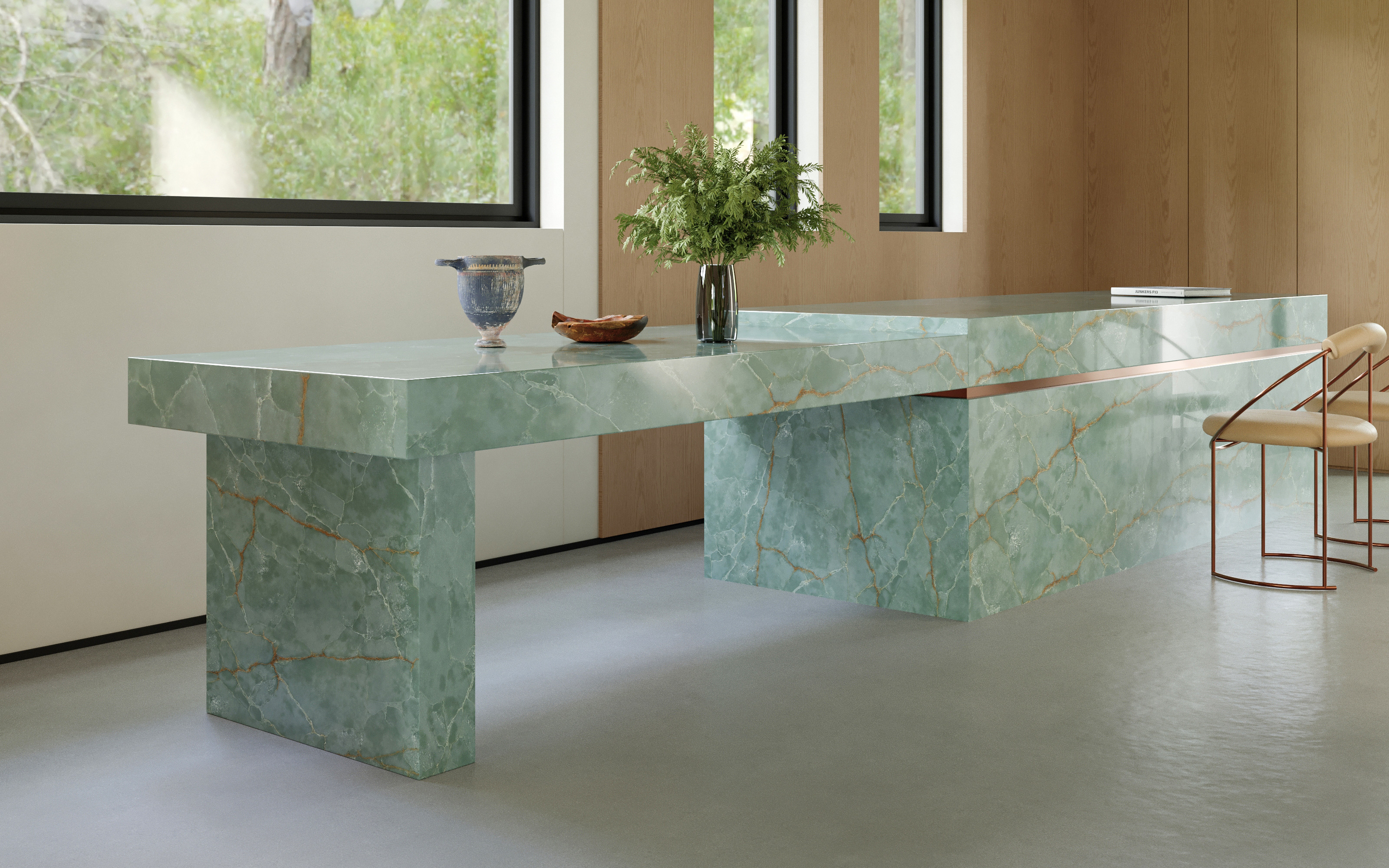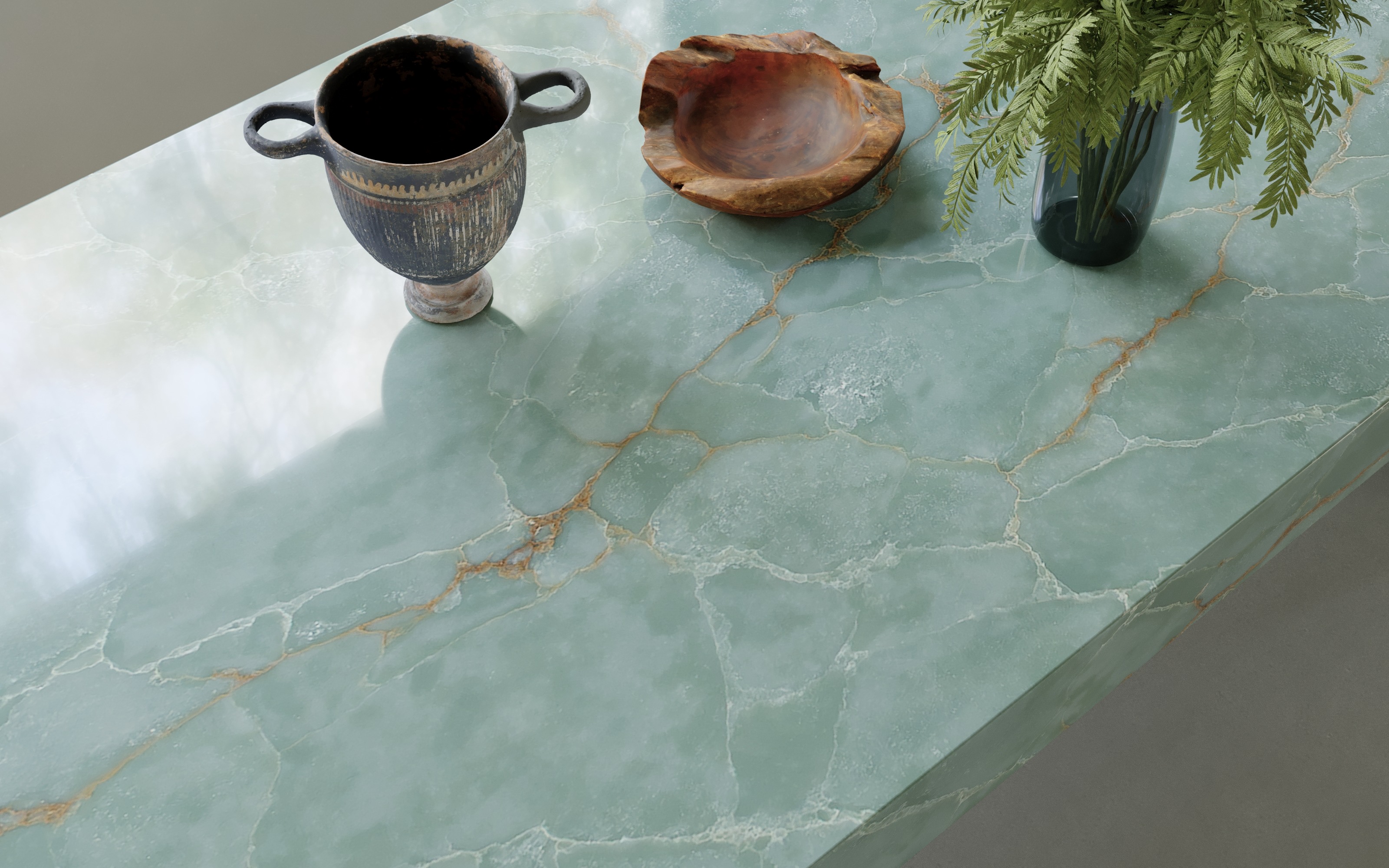 This luxurious green onyx features a rich, translucent base in jade tones, interlaced with golden caramel veining that forms an intricate, web-like pattern. Its crystalline texture and natural depth create a luminous, gem-like effect. Perfect for statement walls, dramatic countertops, or artistic applications.