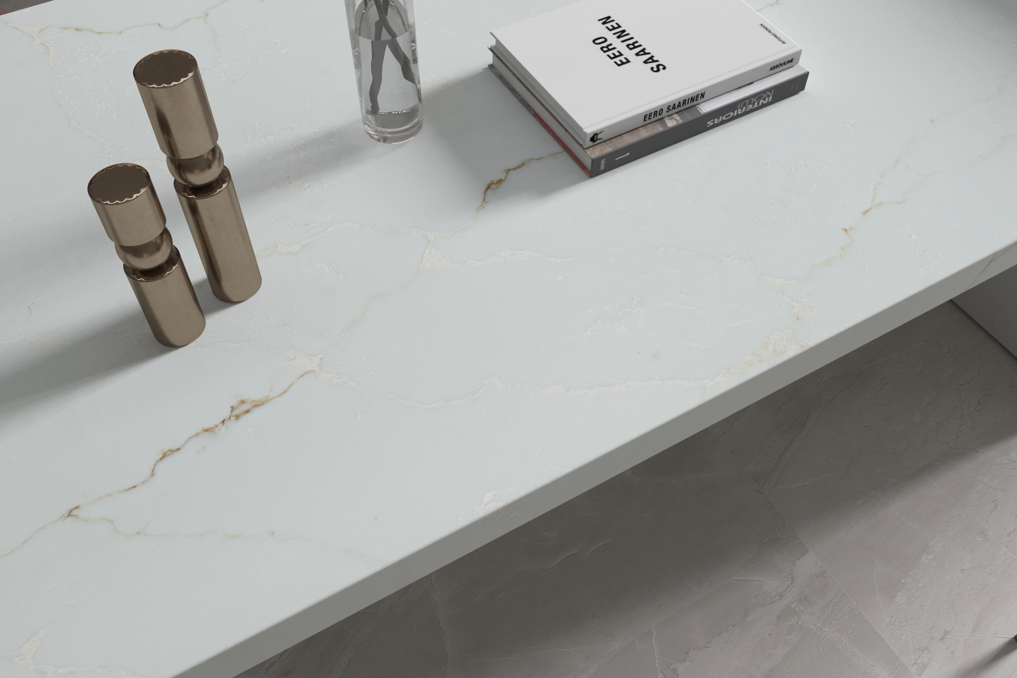This refined quartz showcases a cool, misty grey backdrop accented by delicate ivory and taupe veining that meanders softly across the surface. Its understated elegance and subtle tonal variation evoke a modern yet timeless aesthetic.