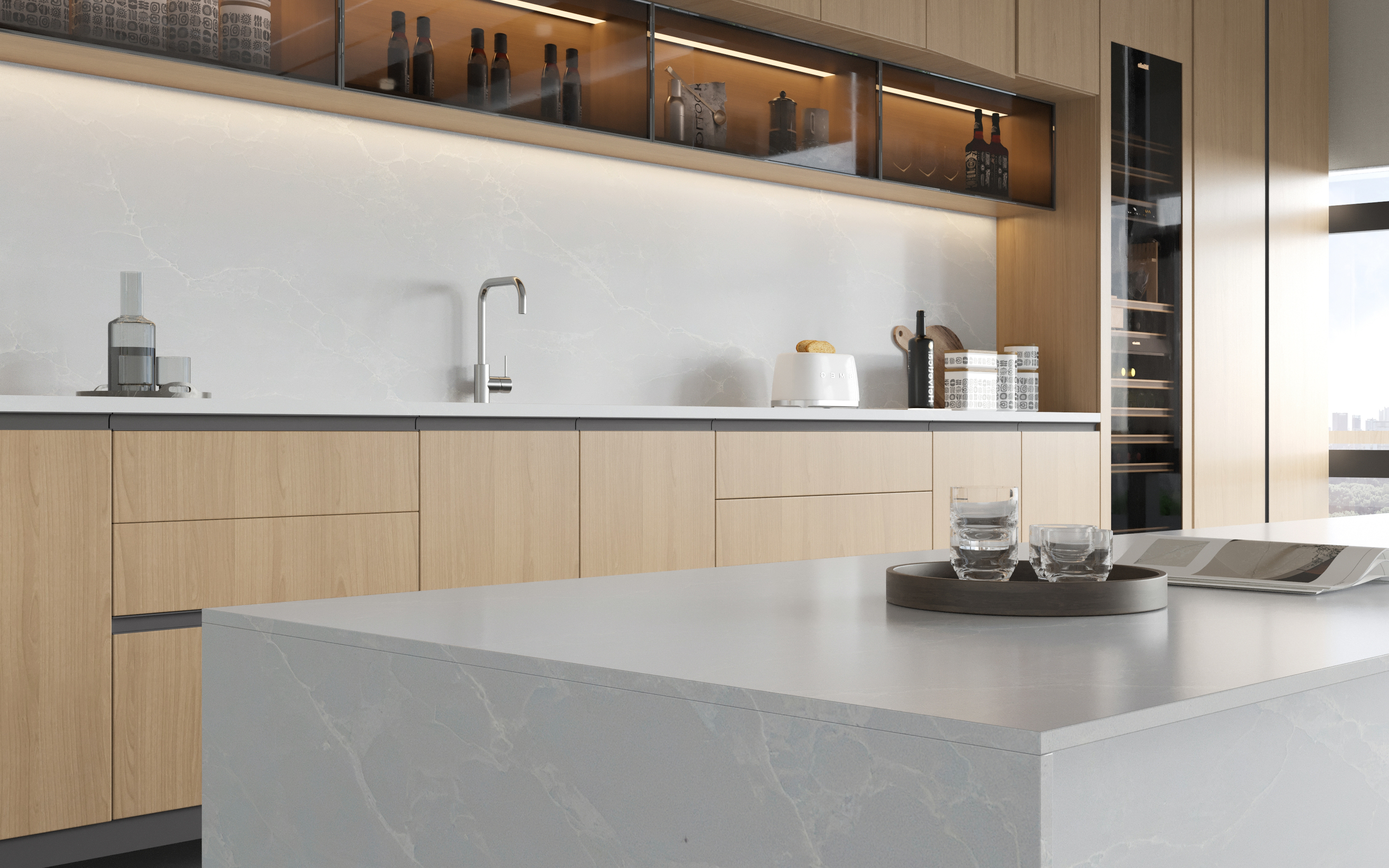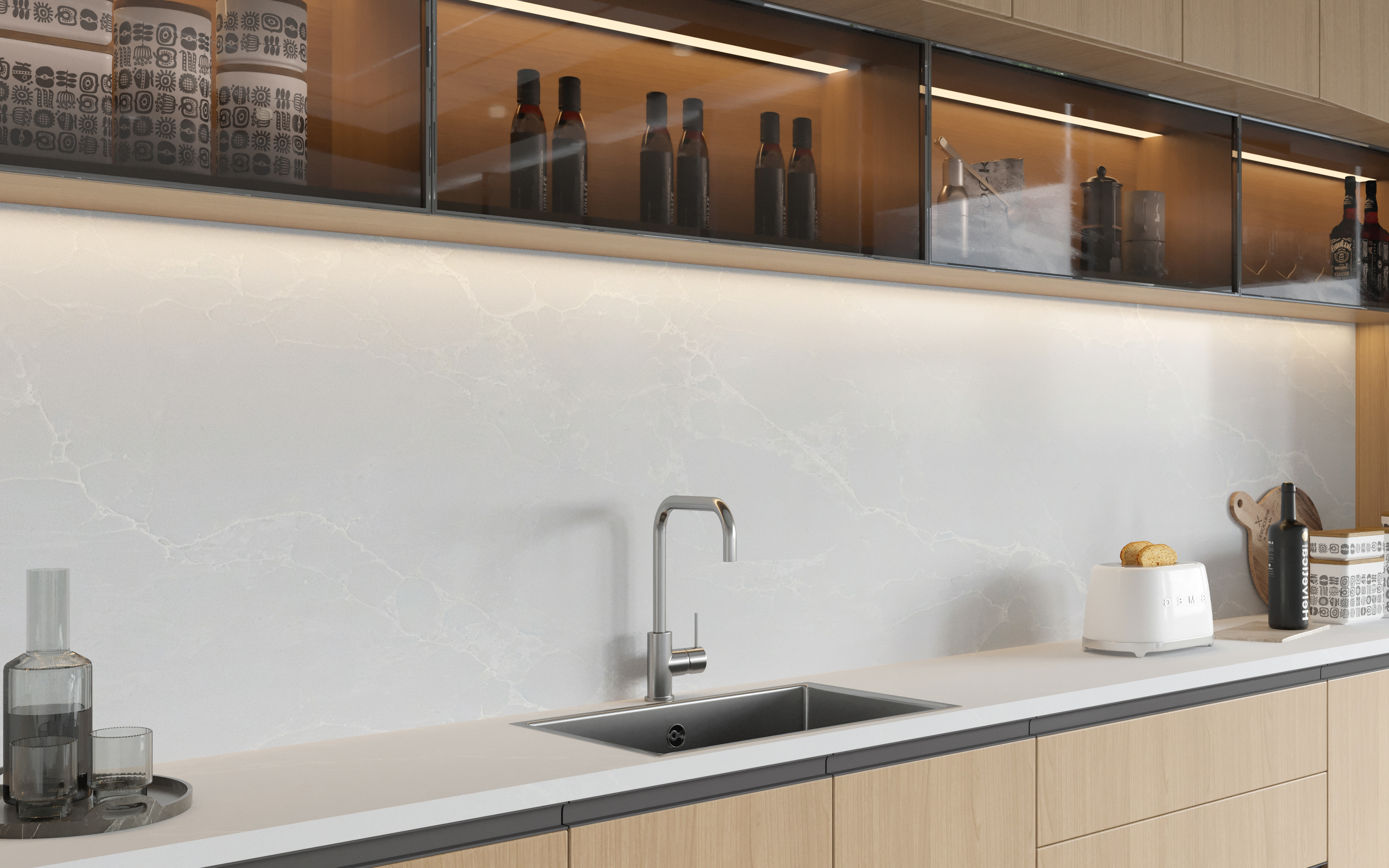 This delicate surface features a crisp, icy-white background subtly interwoven with cloud-like veining in pale silver. Its clean, luminous surface adds a sense of openness and refinement. Ideal for bright, modern spaces seeking a minimalist yet sophisticated touch.