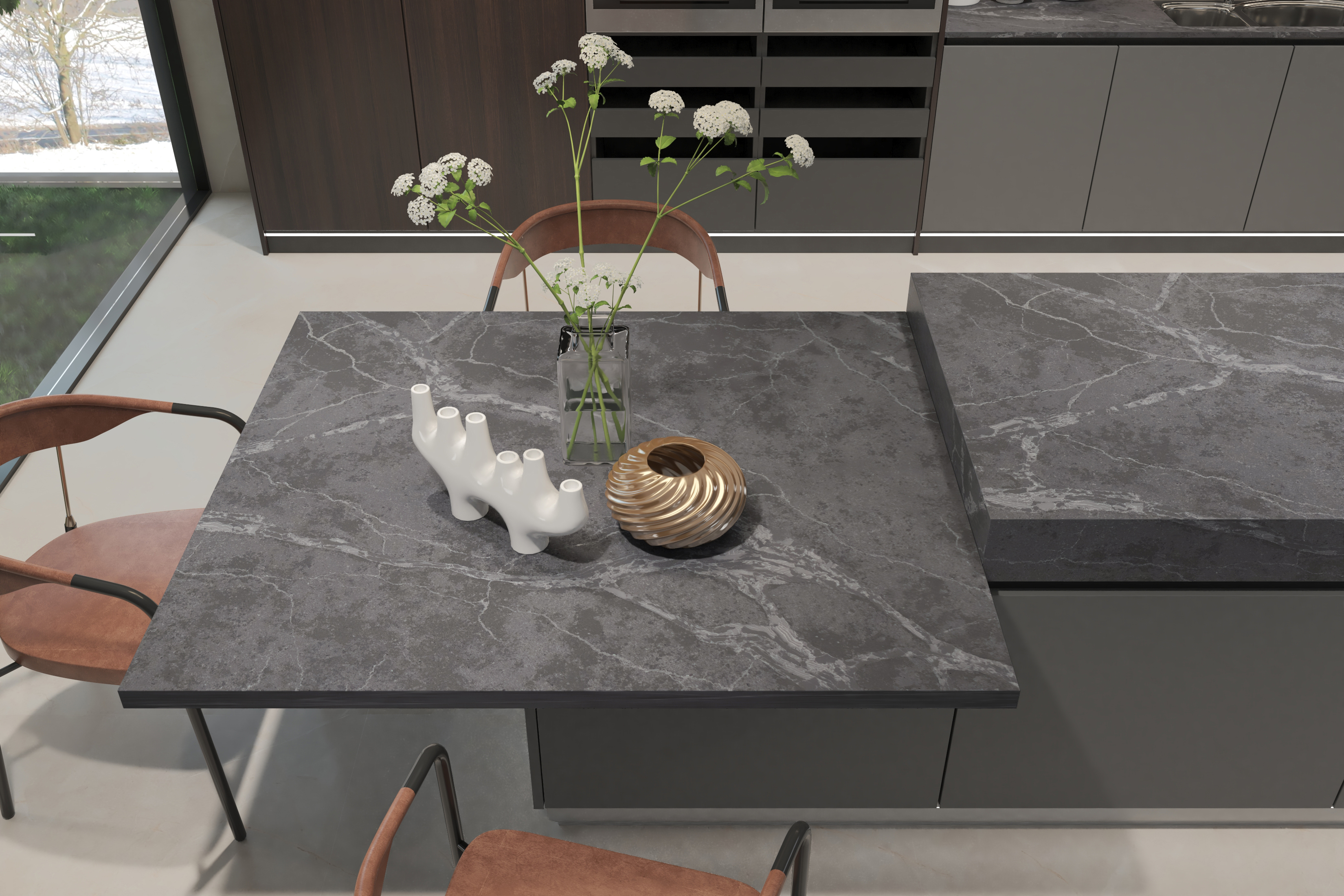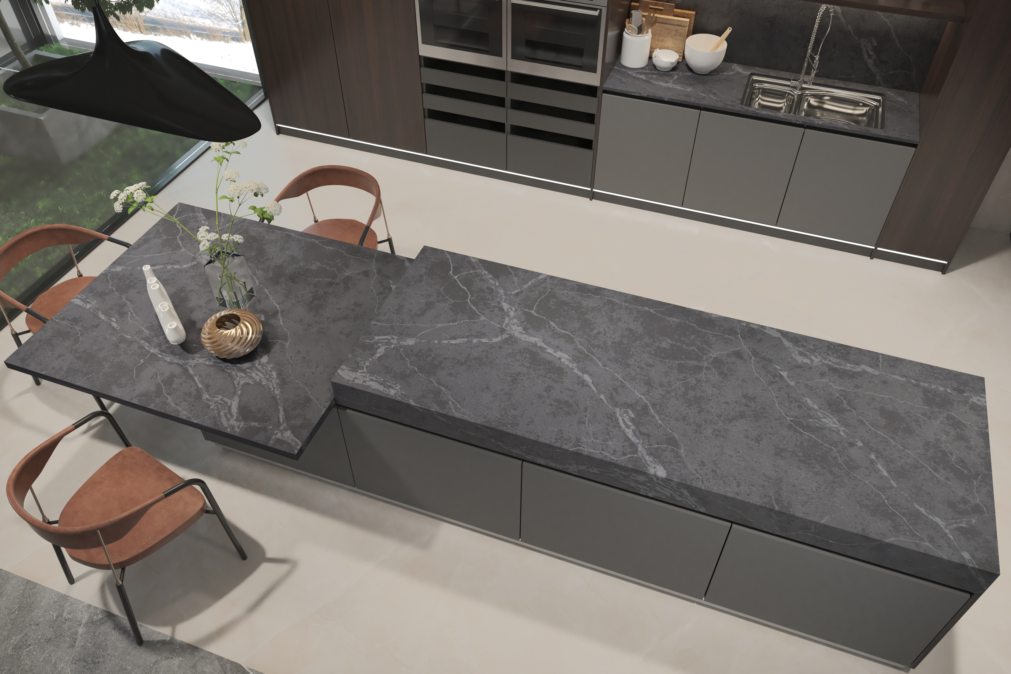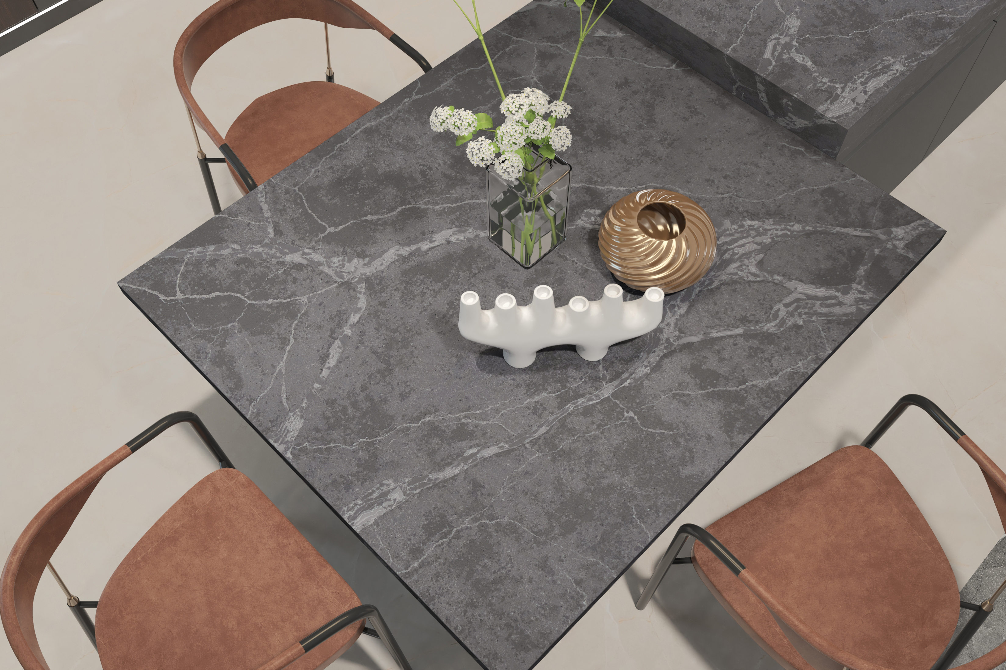 Carbonelli is a striking dark quartz slab featuring deep charcoal tones laced with dramatic white veining. Its bold contrast and fine-grained texture make it a luxurious choice for modern kitchens, bathrooms, or statement walls.