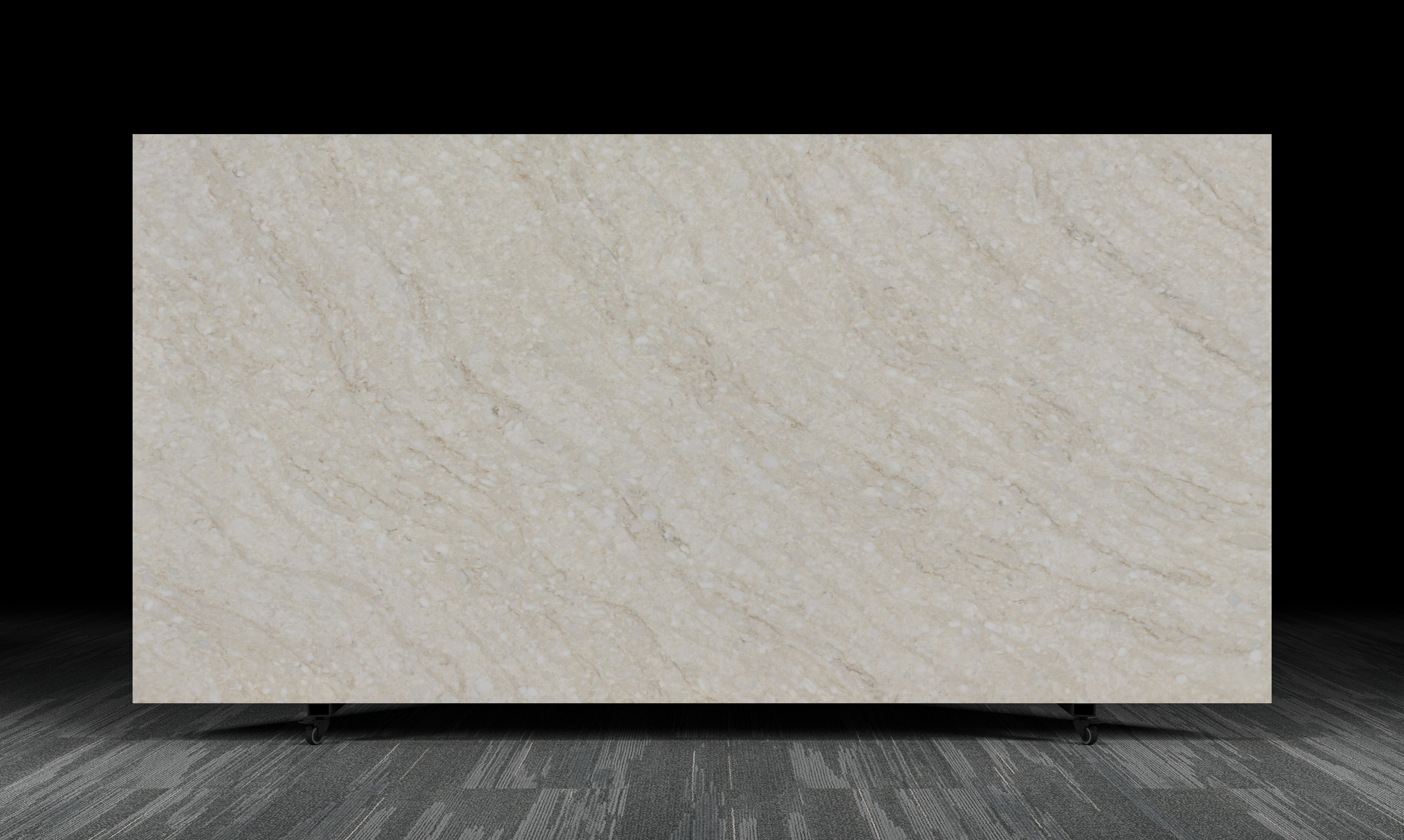 This warm-toned quartz slab features a soft, sandy beige background with gentle waves of cream and light taupe, creating a sense of natural movement. Subtle crystalline textures add depth and luminosity to the surface.