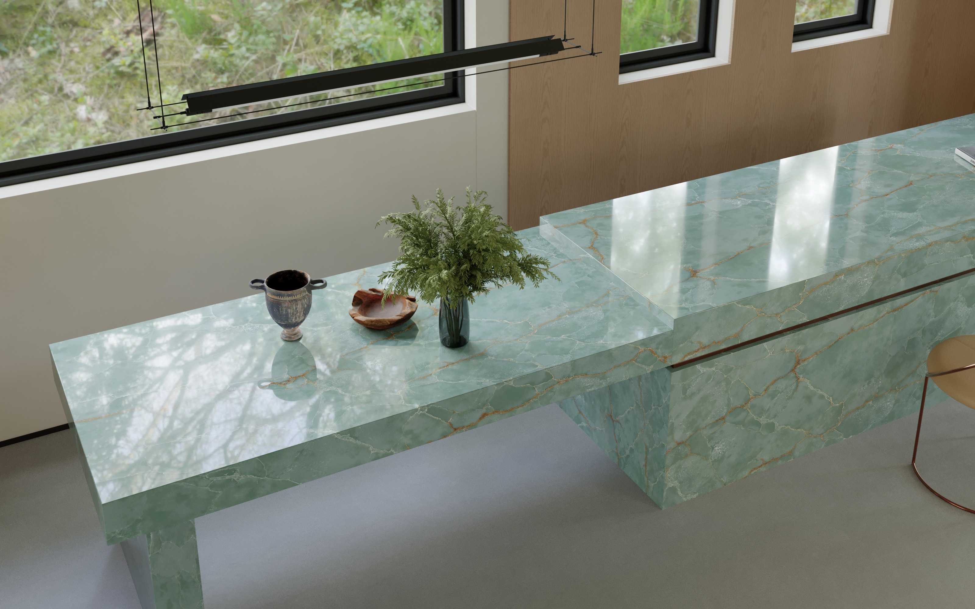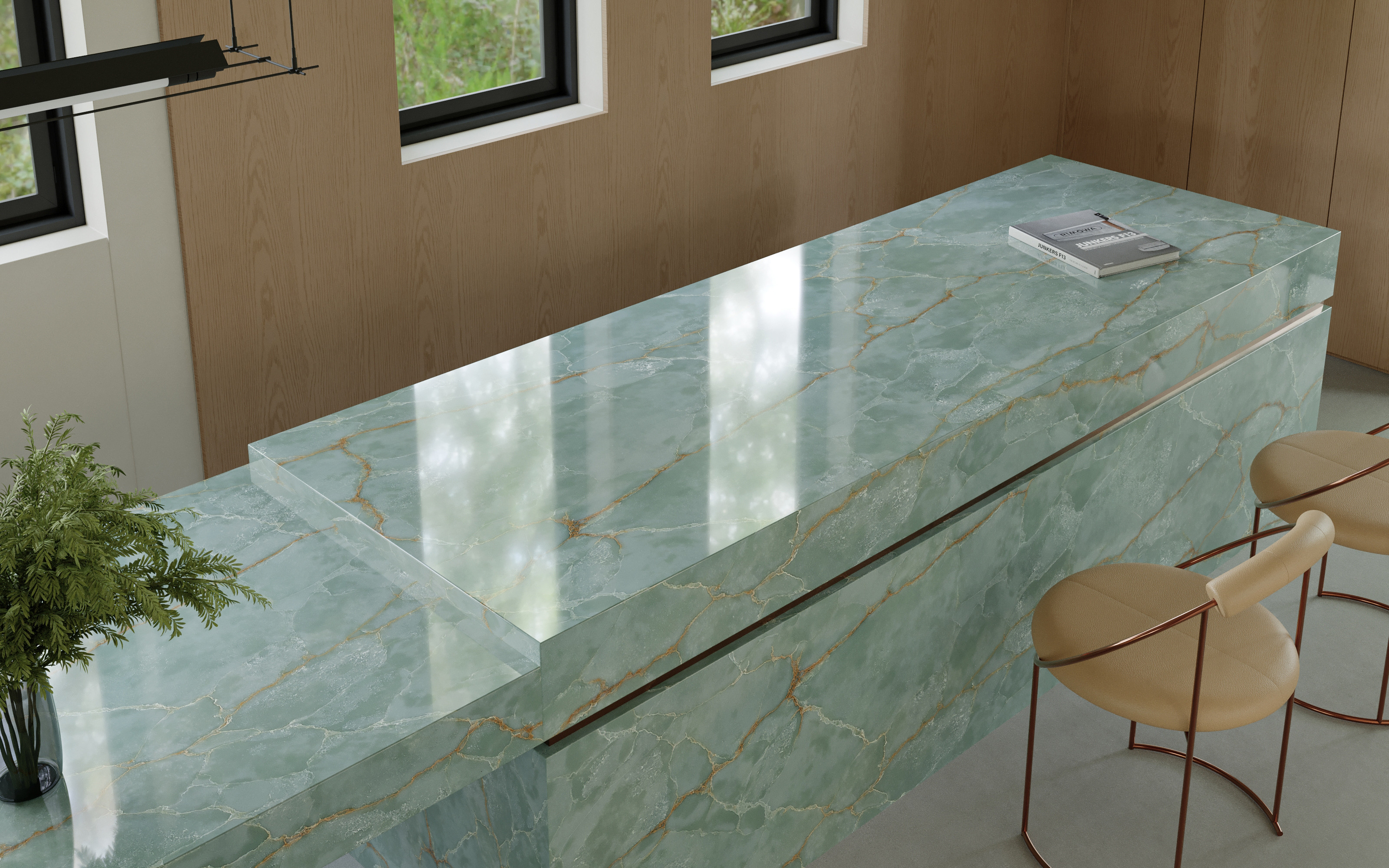 This luxurious green onyx features a rich, translucent base in jade tones, interlaced with golden caramel veining that forms an intricate, web-like pattern. Its crystalline texture and natural depth create a luminous, gem-like effect. Perfect for statement walls, dramatic countertops, or artistic applications.