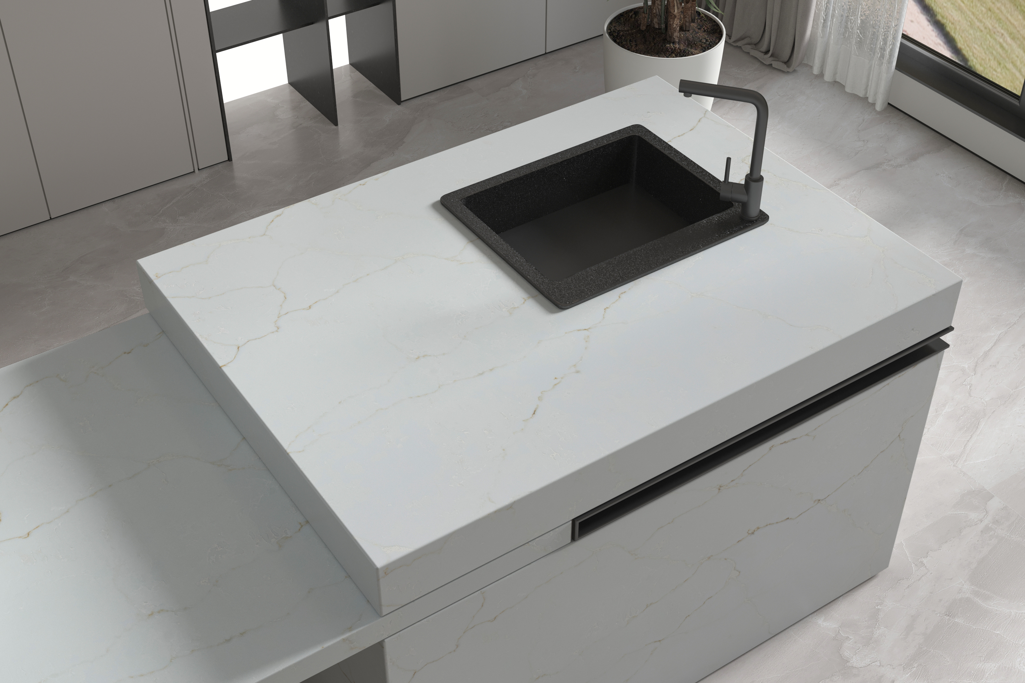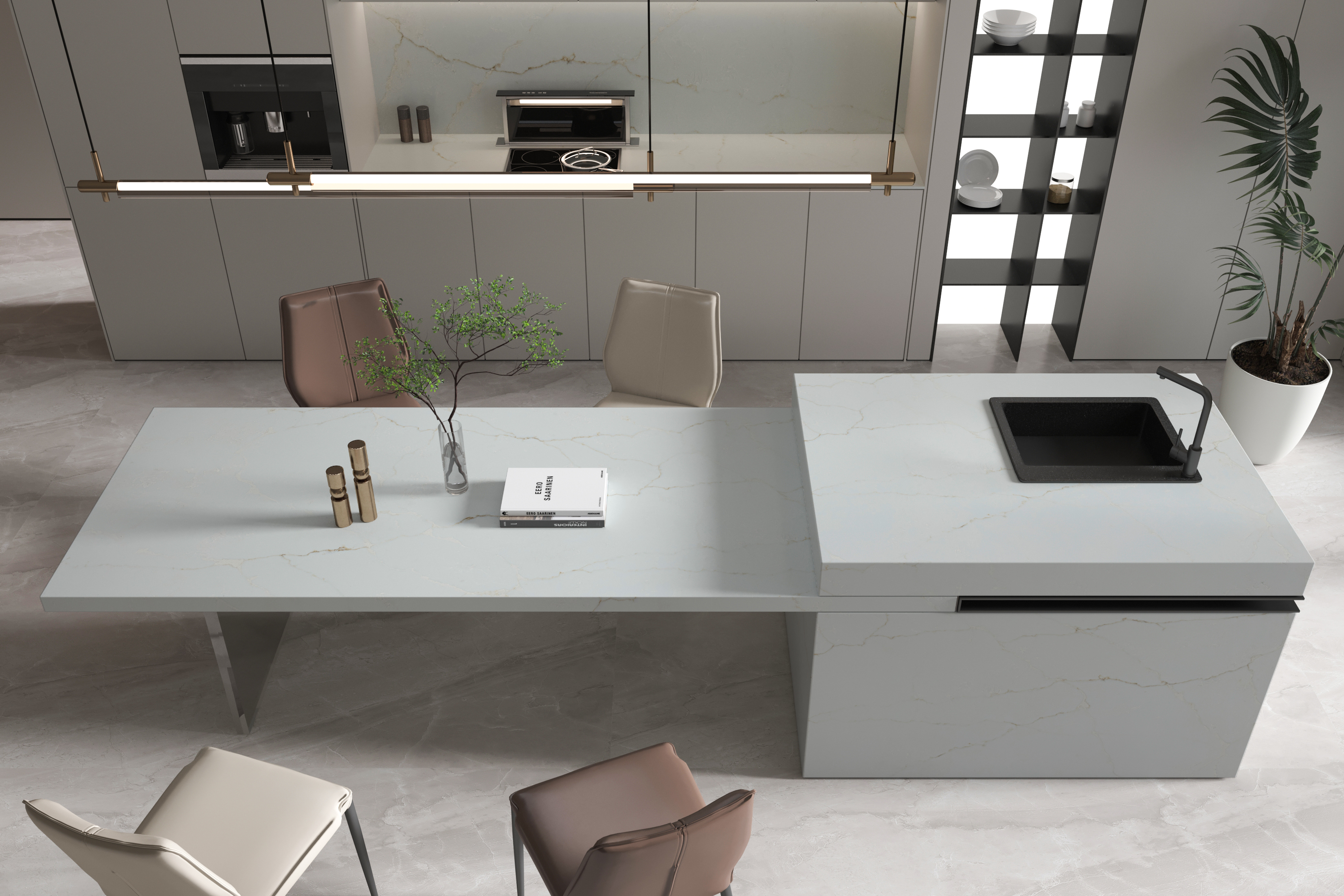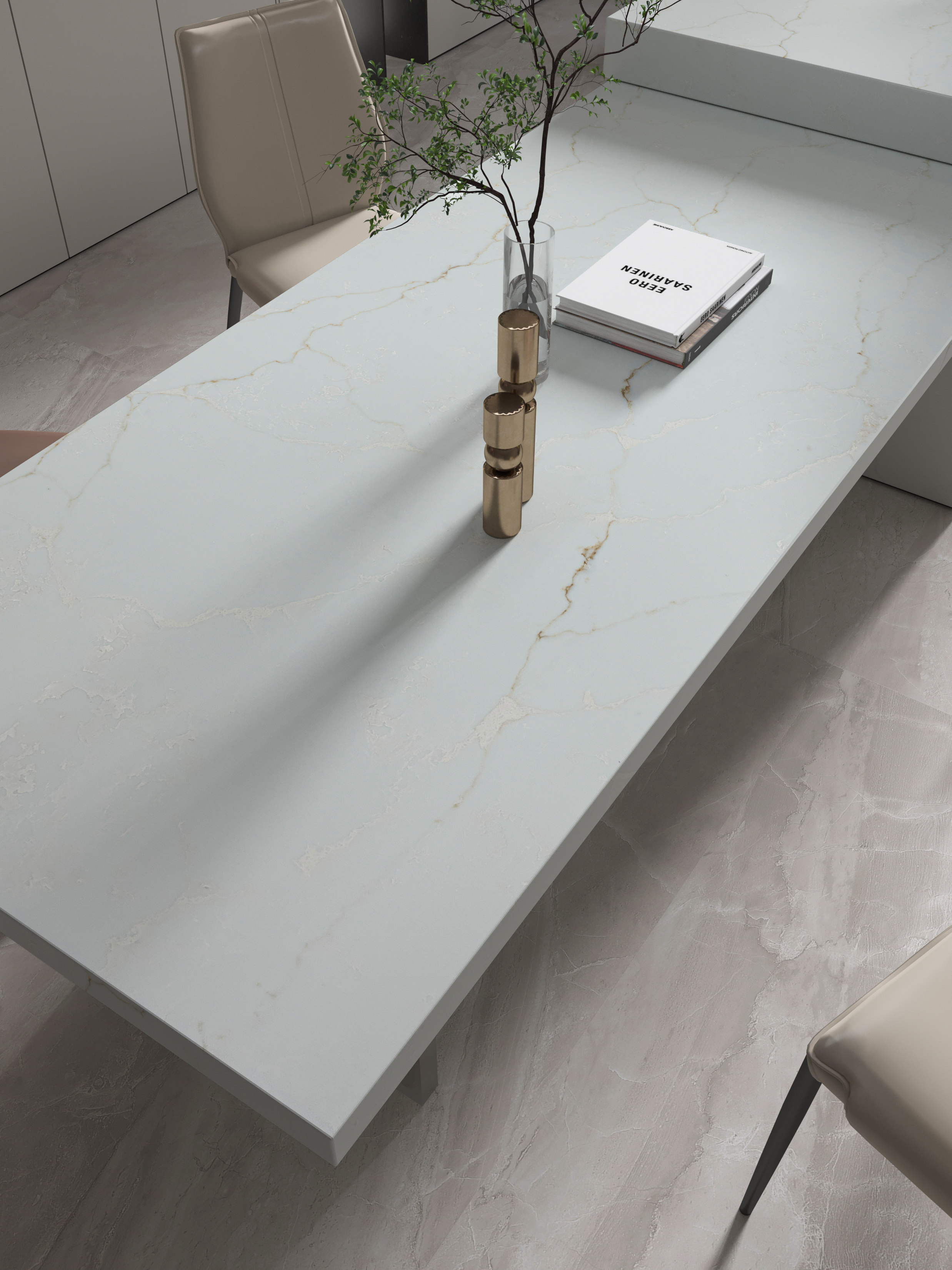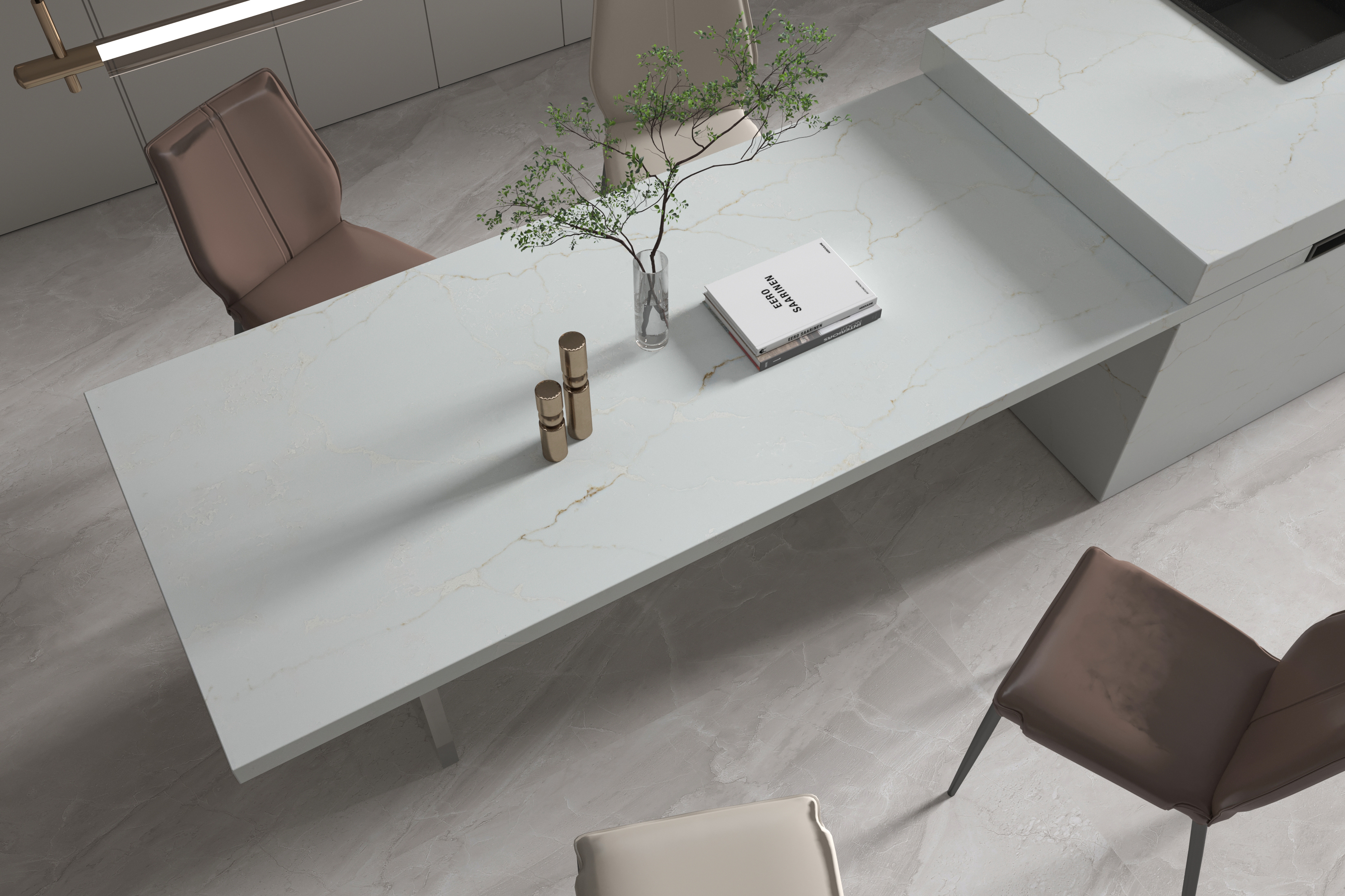 This refined quartz showcases a cool, misty grey backdrop accented by delicate ivory and taupe veining that meanders softly across the surface. Its understated elegance and subtle tonal variation evoke a modern yet timeless aesthetic.